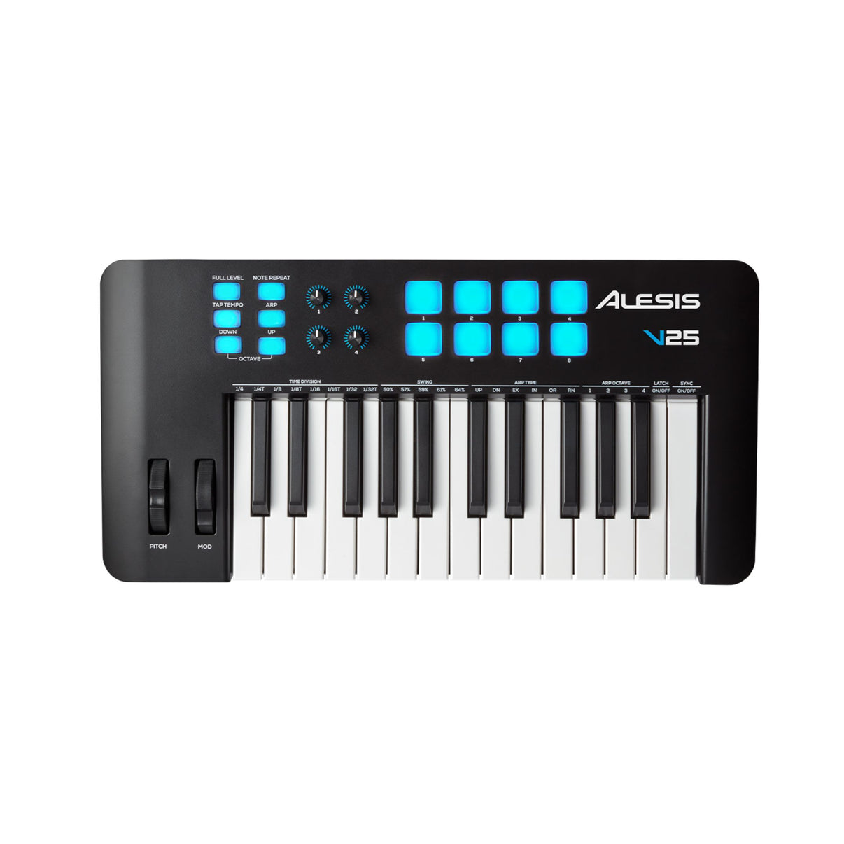 Introducing the Alesis V25 MKII, a 25-key USB MIDI keyboard and music production controller. This versatile USB MIDI controller comes equipped with everything needed to take your ideas from concept to final production - synth-action keys that are springy and responsive, velocity-sensitive pads, assignable knobs, Octave and Transpose buttons for accessing the full piano range, Pitch Bend and Modulation wheels for added expression, and an Arpeggiator with 6 modes for creating unique melodies and inspiring creativity. There’s also a sustain pedal input for truly expressive control. Plug in the V25 MKII, and instantly turn your PC or Mac into a full-featured music production studio.