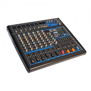 | Master Controls: | • 16 Digital Effect Processor • Effect Repeat Potentiometer • Effect Send Level Potentiometer • Effects Level Fader, 60mm • Monitor Send Potentiometer • 2TK Play / MP3-USB Level Potentiometer, Switchable • MP3-USB / SD Card Media player & Bluetooth module, LCD Screen (Play, Pause, Folder select, >>,<<) • Headphones Potentiometer • 48V Phantom switchable Channels 1-3 & Channels 4-6 • Individual Left & Right Master Level Faders, 60mm • Mix Out Fader, 60mm • 12 Bar LED Master Level /Mix Out- Monitor Indicators, switchable • 7 Band Graphic Equaliser, +/- 12dB (100, 250, 500, 1K, 2K, 4K, 8K – Hz) |