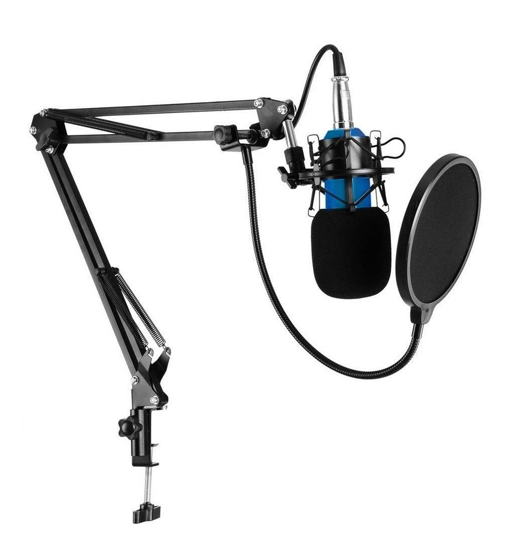 Included in the box is the condenser microphone, cable (XLR to mini-jack to connect directly to a PC), Metal Shock Mount, Microphone Sponge, Pop Filter, adjustable metal scissor arm mic stand (boom arm)