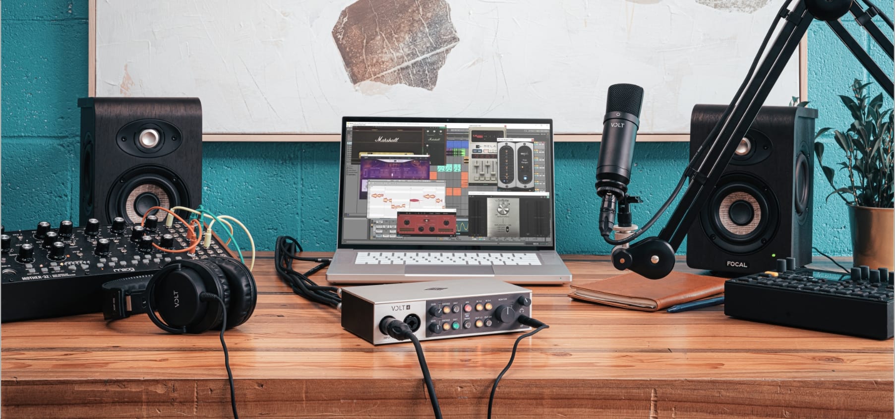 Volt 4 gives you simple audio connections to quickly get started. Just plug your mics and guitars into the front panel preamps, and use the line inputs for synths and drum machines. Then connect your speakers or headphones to monitor your audio with no latency. With Volt, you’ll be creating like a pro, fast.