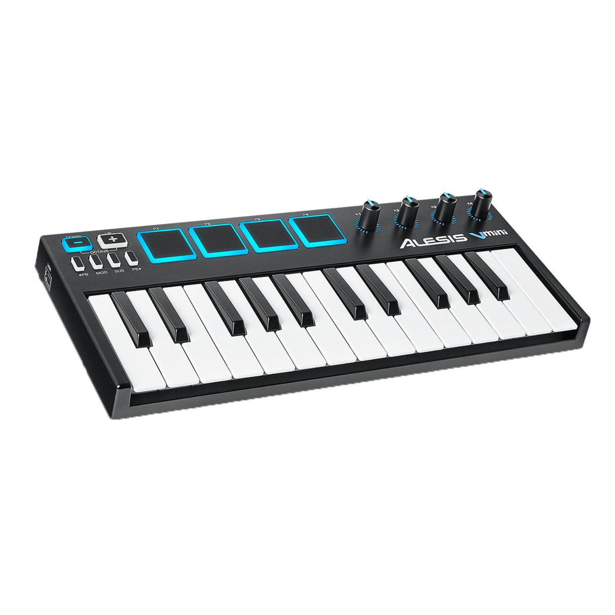 The Alesis V Mini is a powerful, intuitive, and portable MIDI controller that lets you take full command of your music software. With 25 mini-size velocity-sensitive keys and Octave Up/Down buttons, you can expand the keyboard to the full melodic range and play bass lines, chords, and melodies. V Mini also features four assignable knobs for manipulating effect plugins and virtual instruments: open and close filters, adjust volume levels, activate effects, tweak parameters, and more. Four velocity-sensitive backlit pads allow you to launch clips or finger drum with exceptional response, and pitch, modulation, and sustain buttons expand the expressive capabilities of your performing.