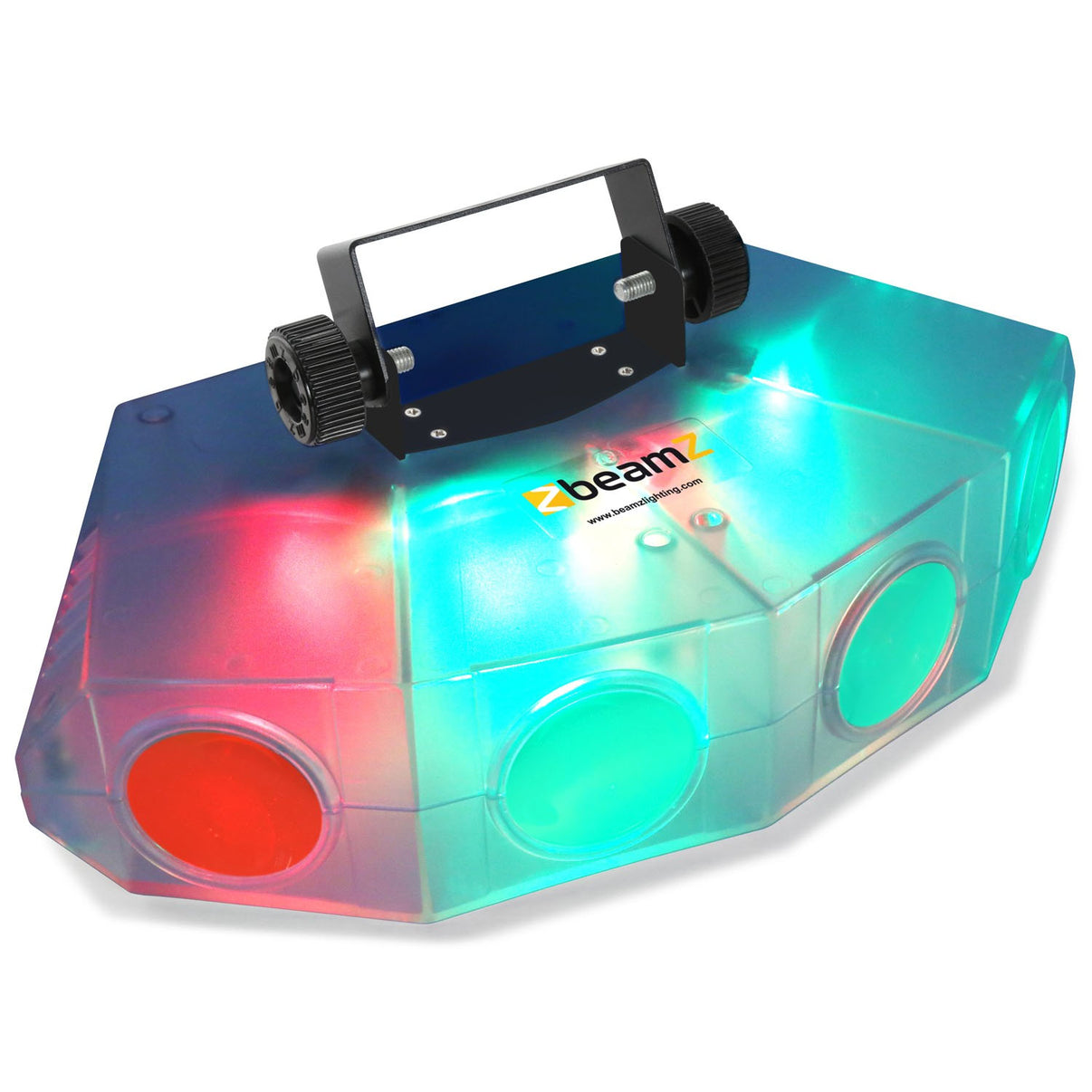 A clear housed multi-flower light effect with 4 LED lens. Ideal for any starting DJ or entertainer, plug and play design. Because of the transparent housing the effect will not only project its beams on the dance-floor but also illuminate itself. The effect works both on a stand-alone automatic mode or can be set to sound activation. Both these settings can easily be changed with the supplied infrared remote control.- 132x RGBA LEDs