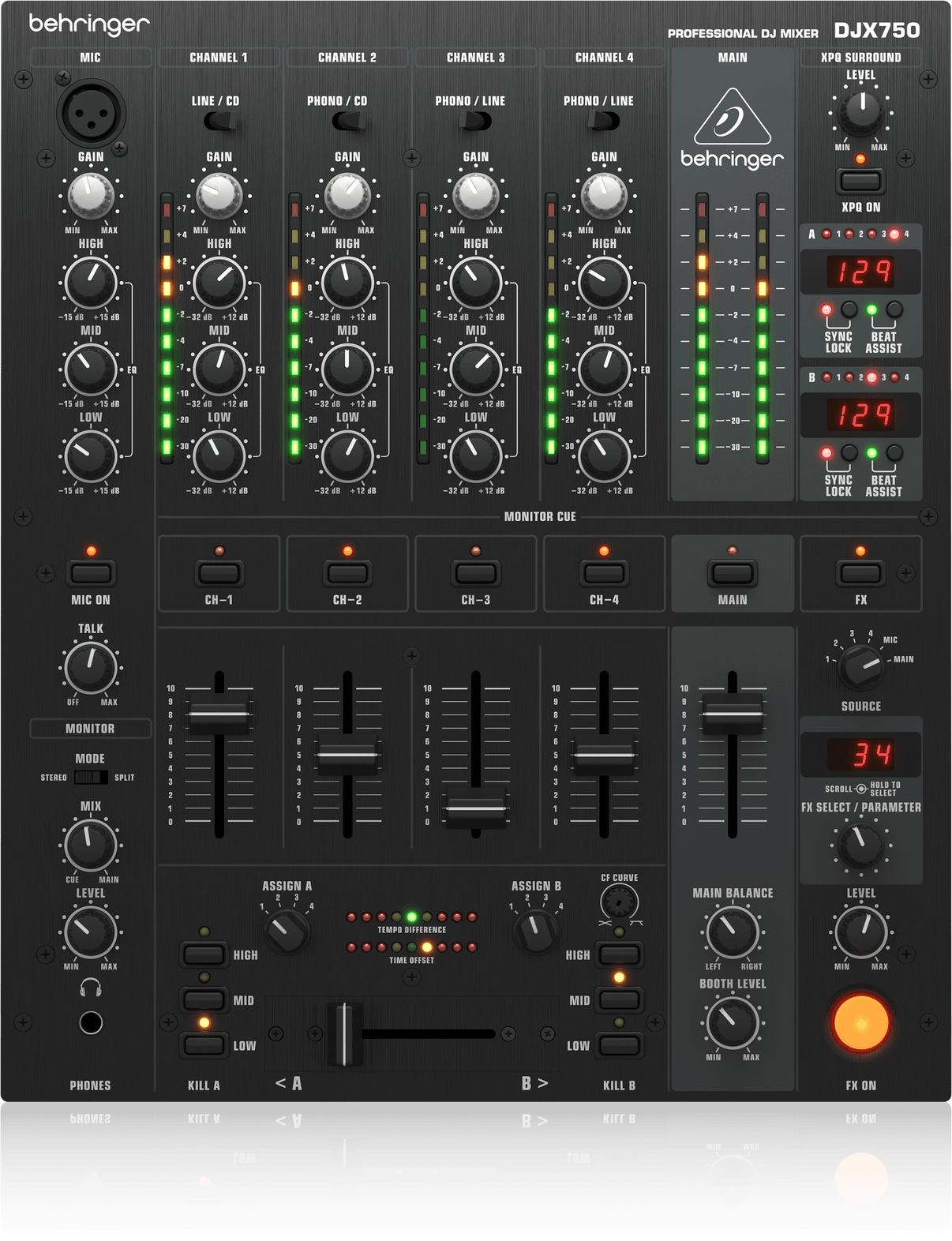 Because your voice is your instrument, the DJX750 features a dedicated mic channel with a built-in Talkover function that automatically detects your voice and brings down the volume of the music track (referred to as “ducking”), so your voice is always out front. Vocal fine-tuning is handled by the onboard 3-band EQ, which provides up to 15 dB of boost or cut at Low (80 Hz), Mid (2.5 k), and High (12 kHz) frequency centers – for an extremely broad tonal palette. Also included in the remarkable DJX750 is our proprietary XPQ 3D stereo surround effect, which lets you create a much broader and enhanced stereo image.