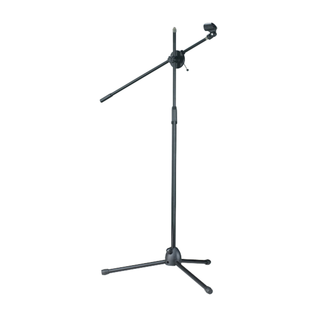 Heavy duty microphone stand with adjustable boom, ergonomic height grip and foldable tripod base.