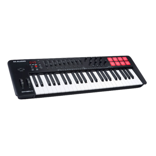 The Oxygen 49 USB MIDI controller delivers next-generation functionality from M-Audio®, the leading innovator in mobile music production technology. Oxygen 49 features eight assignable knobs and nine assignable sliders, plus dedicated transport and track select buttons. DirectLink mode automatically maps these controls to common DAW functions* including transport, mixer, track pan and plug-in parameters. Built-in factory presets offer support for popular virtual instruments right out of the box—no complicated setup required. Velocity-sensitive keys and a sleek, compact design round out a portable keyboard that’s perfect for both production and performance. No other MIDI controller in this price range has so much functionality while remaining easy to use.