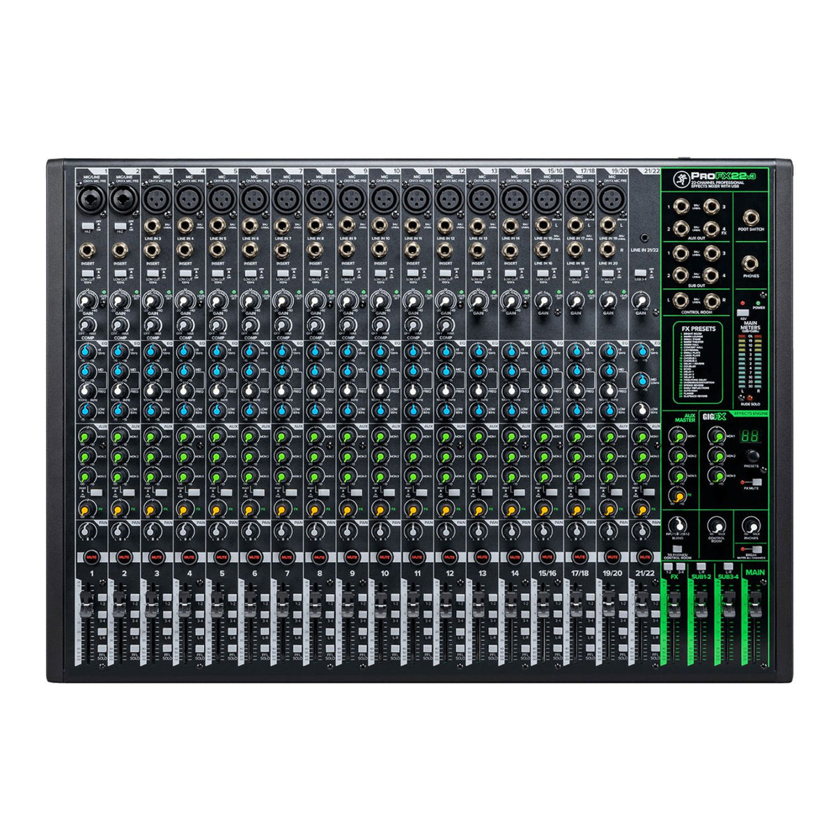 The Mackie ProFX22v3 features seven award-winning Onyx mic preamps for capturing pristine audio in the studio or on stage. Ultra-low noise and up to 60dB of gain means tons of headroom and clarity for any microphone.