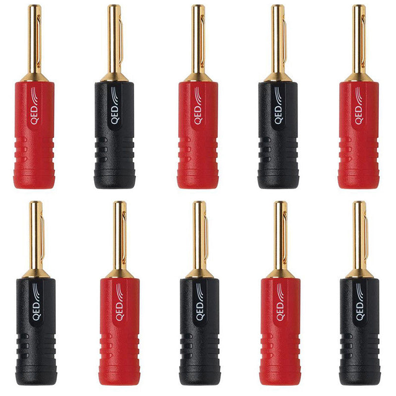 Both the banana plugs and spades are made of brass which has roughly twice the resistivity of copper. For this reason the plug was devised so that its cross-sectional area would be at least double that of the cable to which it was connected effectively cancelling out the extra resistance of the plug material. QED then plates the connector with high purity gold which has a resistivity almost as low as copper but more importantly does not oxidise in air.