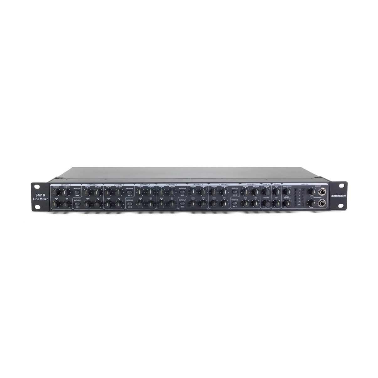 The SM10 features ten channels of 1/4-inch stereo line inputs and a balance control for each channel. Two channels are XLR microphone inputs. This allows you to mix the relative levels of the stereo inputs to your liking. In addition, each channel has a switch for +4 dBu or -10 dBV line level input.