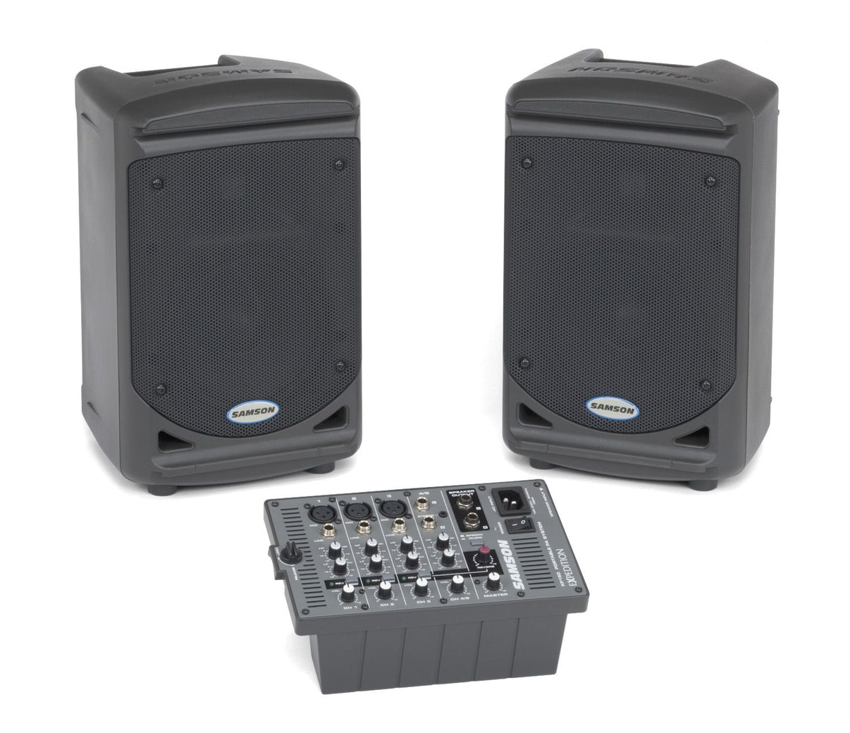 The Expedition XP150 Portable PA System from Samson is a compact PA system with dual 2-way speakers, a 5-channel mixer and a 150 watt power amplifier that packs into a single unit weighing 24 pounds. The XP150 is a mobile PA system that can be used in a variety of small- to medium-size PA applications such as musical performances, school presentations and business conferences.